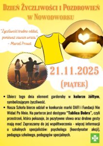 Post author:Agnieszka Jutrowska Post published:17 listopada, 2025 Post category:Aktualności / Pomoc psychologiczno-pedagogiczna Dzień Życzliwości w naszej szkole przebiegał w radosnej, żółtej atmosferze. Wspólnie pokazaliśmy, że dobre słowo i uśmiech potrafią odmienić każdy dzień. Bądźmy dla siebie życzliwi – codziennie! Read more articles Previous PostSukces Marka Piaska Następny wpis„Czas na książkę – książkowi szczęściarze w bibliotece Nowodworka”. Może ci się spodobać również NPRC 2021-2025 – kolejne bestsellery opracowane w systemie – zapraszam do naszej biblioteki. 12 września, 2022 Nagrody i wyróżnienia dla naszych uczennic. 17 grudnia, 2021 Światowy Dzień Osób z Zespołem Downa 21 marca, 2023