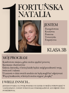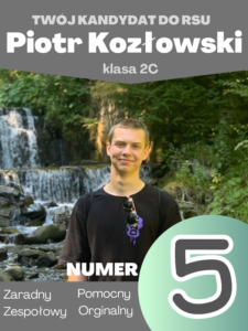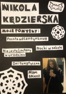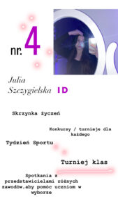 Post author:Agnieszka Jutrowska Post published:2 listopada, 2023 Post category:Aktualności / Samorząd uczniowski Kandydaci w wyborach do Rady Samorządu Uczniowskiego Natalia Fortuńska – III b – nr 1 Weronika Pajonkowska – II c – nr 2 Nikola Kędzierska – I d – nr 3 Julia Szczygielska – I d – nr 4 Piotr Kozłowski – II c – nr 5 Read more articles Previous PostNowodworek dba o zdrowie psychiczne Następny wpisKonkurs plastyczny na plakat – HIV i AIDS Może ci się spodobać również Profilaktyka 4 marca, 2020 Poczta Walentynkowa 13 lutego, 2019 Chemia wokół nas 27 stycznia, 2023