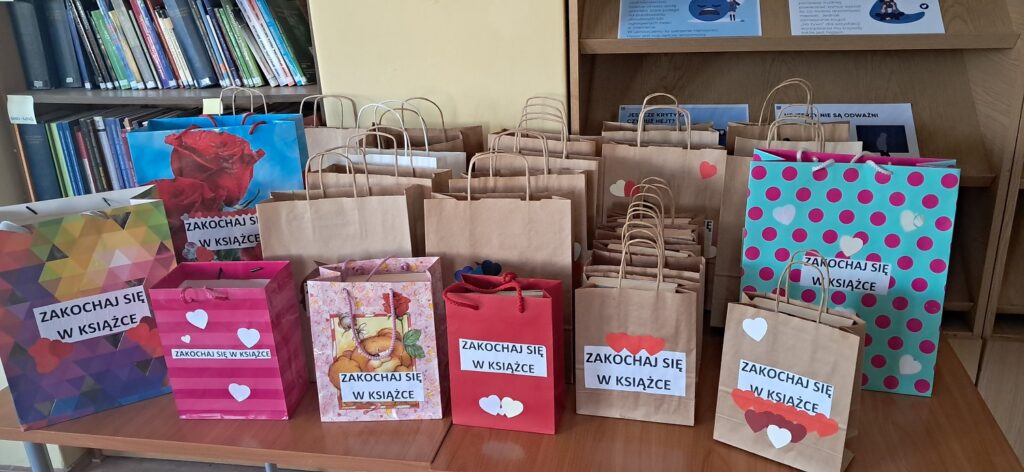 Książki zapakowane w kolorowe torebki i przyozdobione sercami, czekają na swoich czytelników.