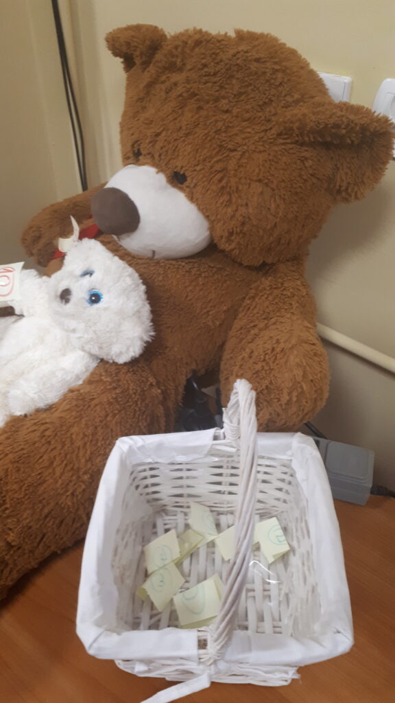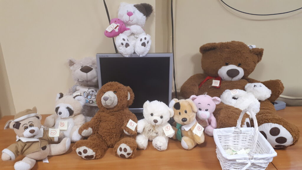 Na koniec spotkania dzieci wylosowały sobie wesołego misia. Bardzo dziękuję młodzieży Nowodworka za podarowanie zabawek dla dzieci. Przytulanki sprawiły dzieciom dużo radości.