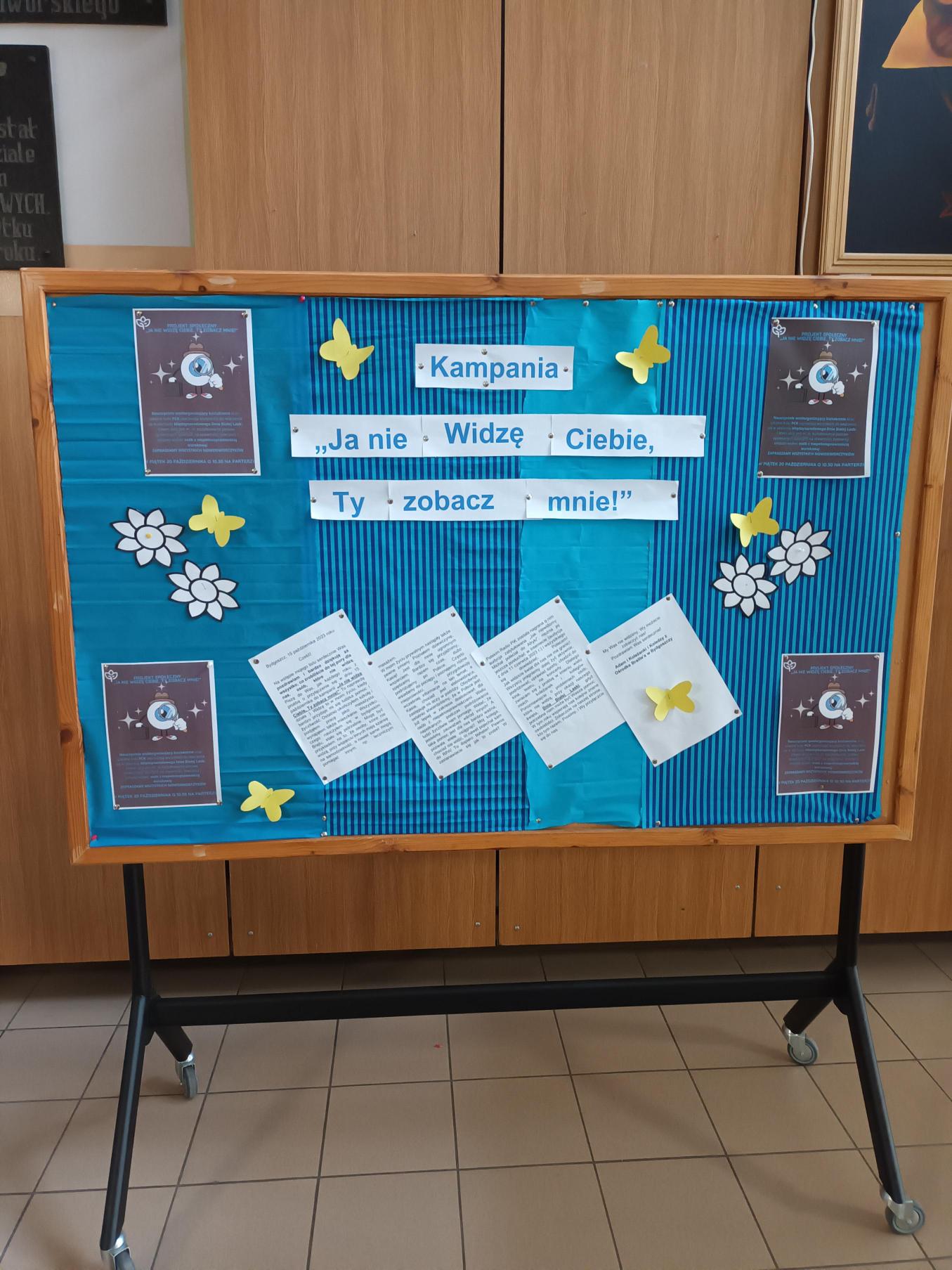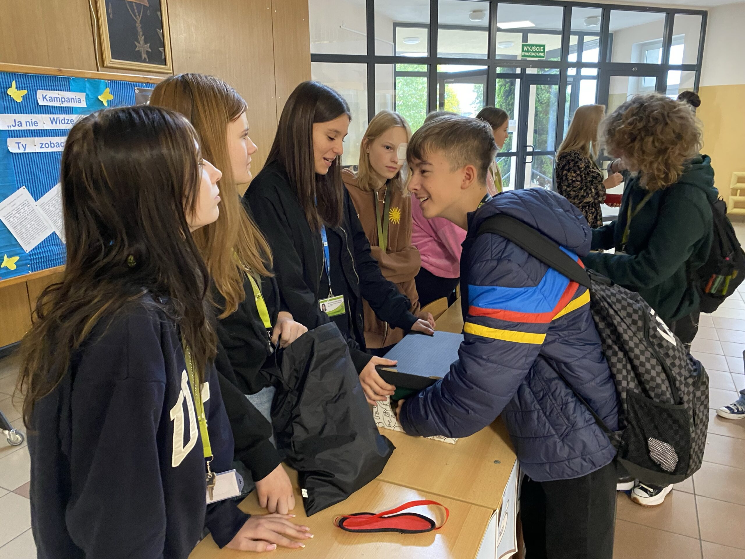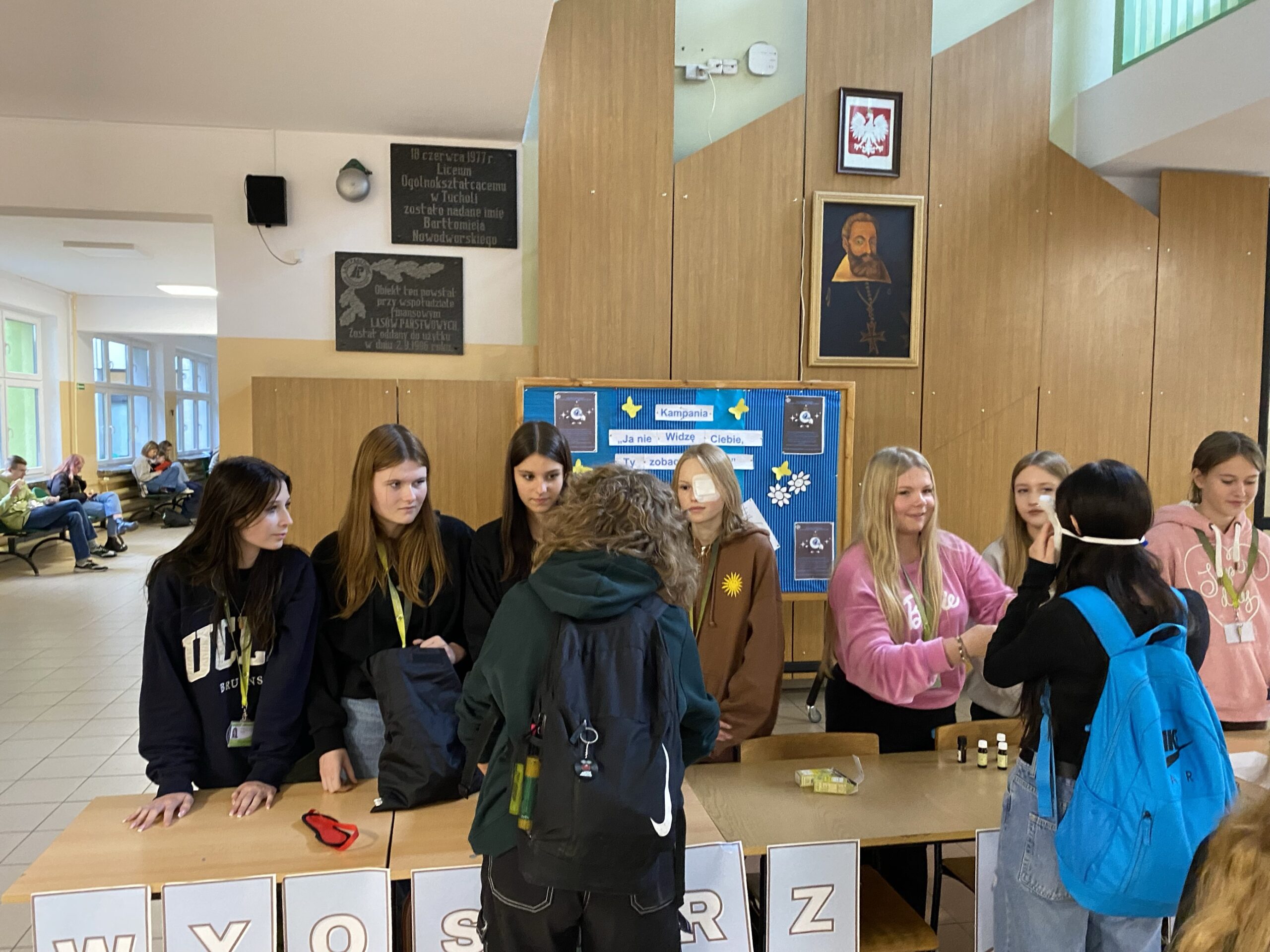 20 października 2023 roku – nauczyciele współorganizujący kształcenie, szkolne koło PCK oraz wolontariusze grupy eM – przyłączyli się do kampanii społecznej „Ja nie widzę ciebie, ty zobacz mnie!”. Przygotowaliśmy dla społeczności Nowodworka ulotki na temat niepełnosprawności wzrokowej oraz wydrukowaliśmy list Adama z Ośrodka Braille’a w Bydgoszczy, a zaangażowani w akcję uczniowie – rozdawali publikacje, aby kształtować postawy społeczne oparte na otwartości, tolerancji i empatii. Ponadto wykonaliśmy gazetkę tematyczną oraz zorganizowaliśmy stoisko – „Wyostrz zmysły”, przy którym uczniowie rozpoznawali z zakrytymi oczami różne zapachy i przedmioty, dodatkowo mogli również zobaczyć i spróbować wykorzystać alfabet Braille’a. Koło Wolontariatu grupy eM ułożyło dla chętnych uczniów quiz na temat niepełnosprawności wzrokowej.