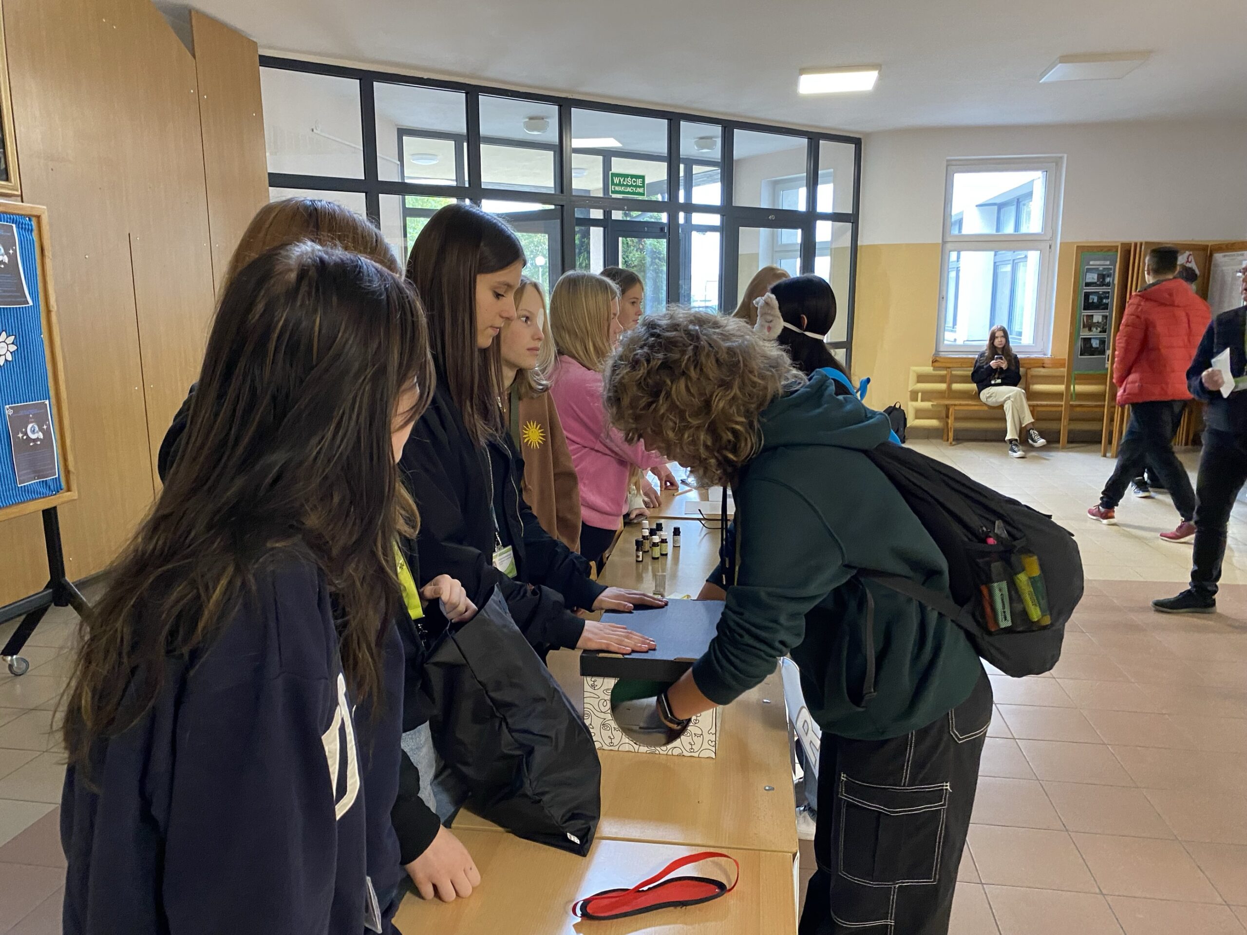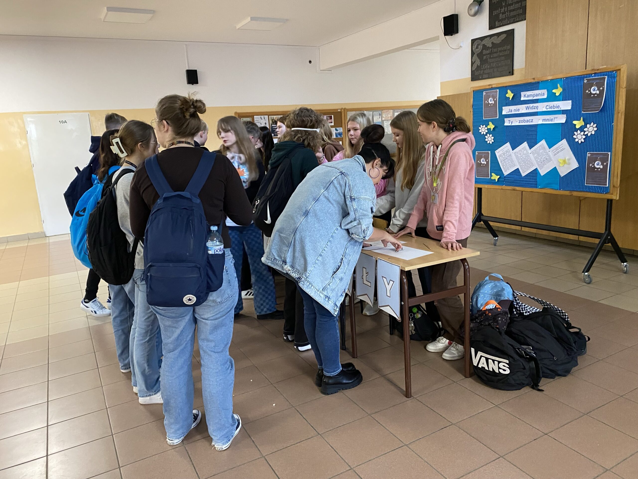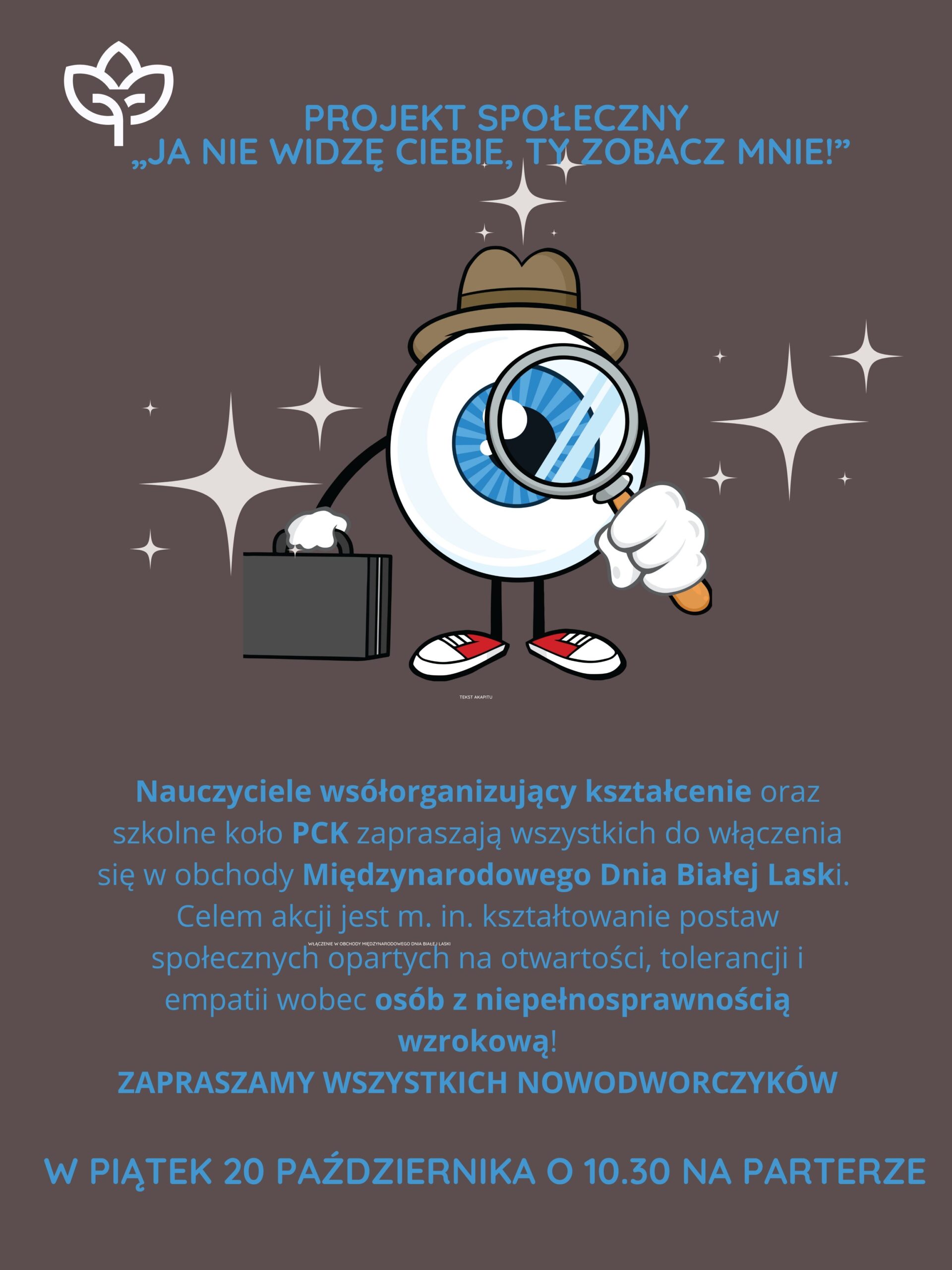 20 października 2023 roku – nauczyciele współorganizujący kształcenie, szkolne koło PCK oraz wolontariusze grupy eM – przyłączyli się do kampanii społecznej „Ja nie widzę ciebie, ty zobacz mnie!”. Przygotowaliśmy dla społeczności Nowodworka ulotki na temat niepełnosprawności wzrokowej oraz wydrukowaliśmy list Adama z Ośrodka Braille’a w Bydgoszczy, a zaangażowani w akcję uczniowie – rozdawali publikacje, aby kształtować postawy społeczne oparte na otwartości, tolerancji i empatii. Ponadto wykonaliśmy gazetkę tematyczną oraz zorganizowaliśmy stoisko – „Wyostrz zmysły”, przy którym uczniowie rozpoznawali z zakrytymi oczami różne zapachy i przedmioty, dodatkowo mogli również zobaczyć i spróbować wykorzystać alfabet Braille’a. Koło Wolontariatu grupy eM ułożyło dla chętnych uczniów quiz na temat niepełnosprawności wzrokowej.