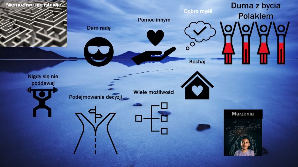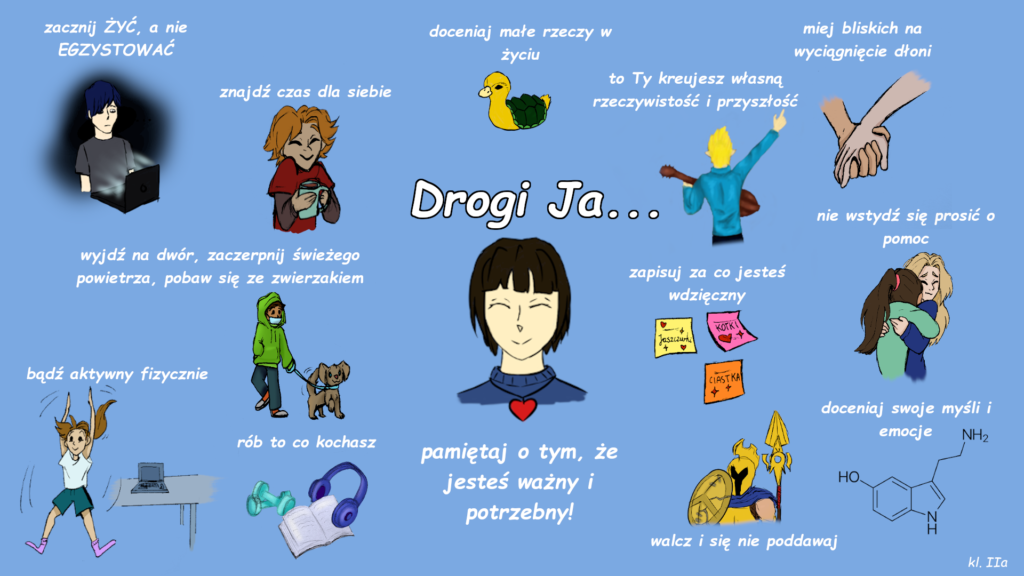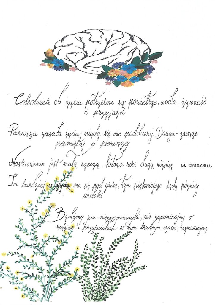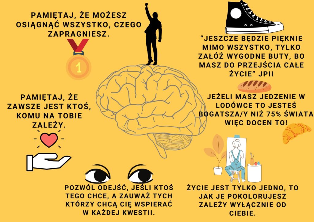 Zbiór zawiera cytaty motywacyjne, wspierające myśli i własne działania uczniów – wszystko to co pomaga im na co dzień zachować dobrostan psychiczny.