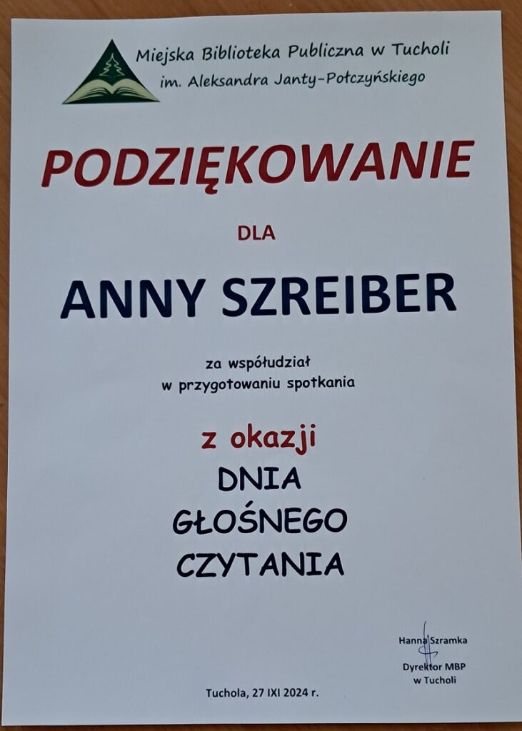 wraz z nauczycielem bibliotekarzem – panią Anną Szreiber uczestniczyli w Ogólnopolskim Dniu Głośnego Czytania zorganizowanym przez Miejską Bibliotekę Publiczną w Tucholi im. A. J. Połczyńskiego oraz bibliotekę Liceum Ogólnokształcącego w Tucholi.