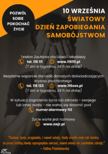 Post author:Agnieszka Jutrowska Post published:10 września, 2024 Post category:Aktualności / Pomoc psychologiczno-pedagogiczna 10 września przypada Światowy Dzień Zapobiegania Samobójstwom. Zachęcamy do zapoznania się z materiałami i udostępniania. psycholog – Justyna Kornaś Read more articles Previous PostPrymus Pomorza i Kujaw II Następny wpisDołącz do Rady Samorządu Uczniowskiego ! Może ci się spodobać również ZŁOTE MYŚLI NA WAKACJE 25 czerwca, 2021 LICEALIA 2021 16 czerwca, 2021 Region Nauk Ścisłych 25 maja, 2023