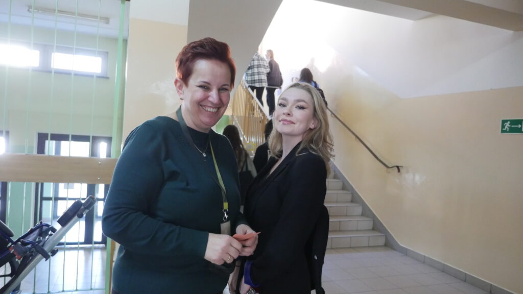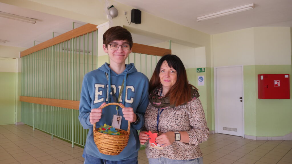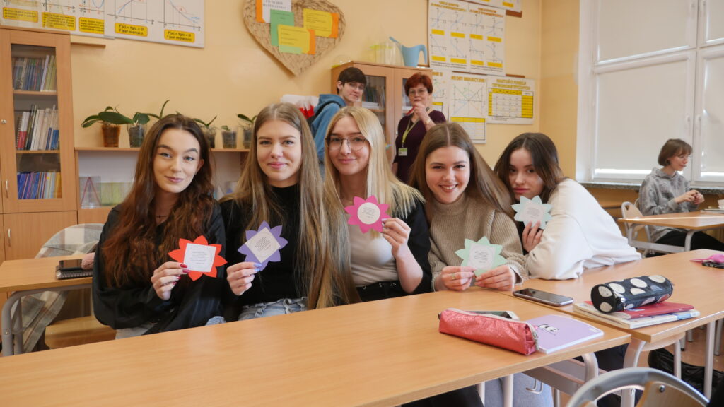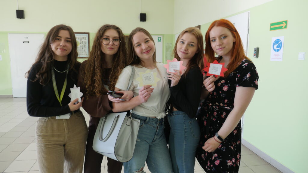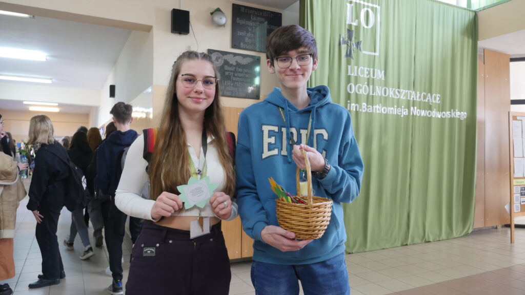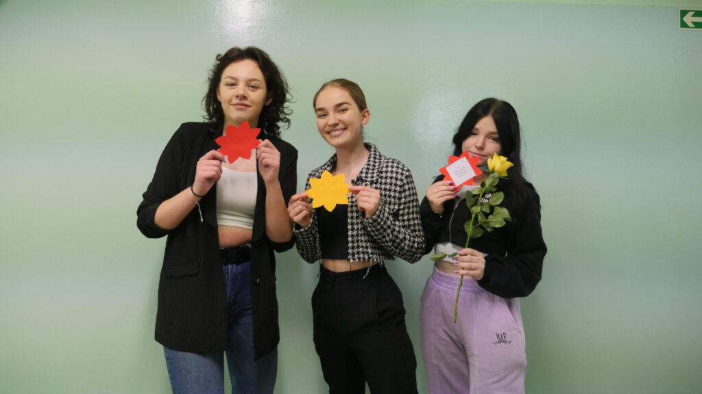 Aby z klasą uhonorować wszystkie kobiety Nowodworka – chłopaki z 3b4 – wręczali własnoręcznie wykonane życzenia 🙂