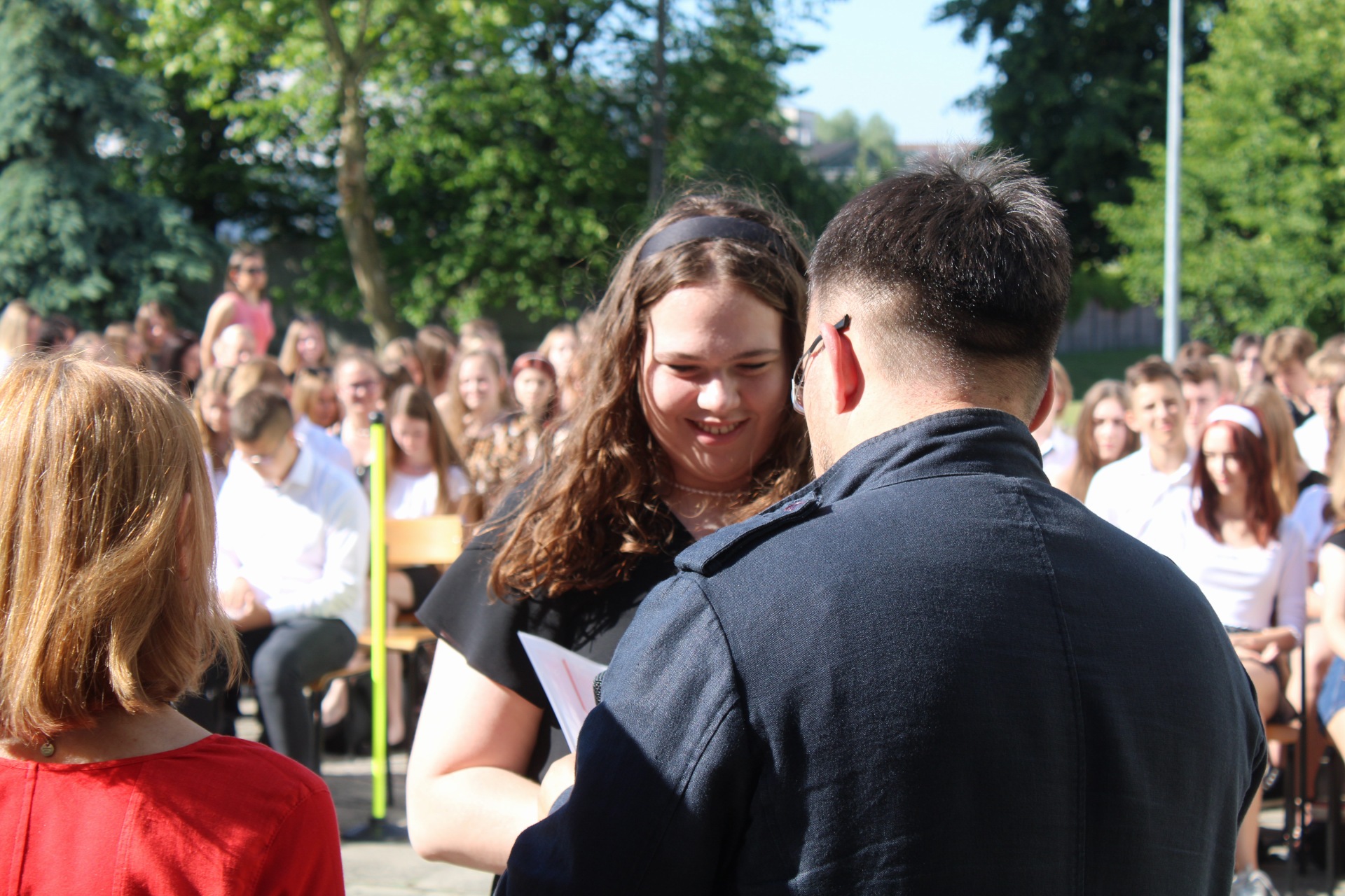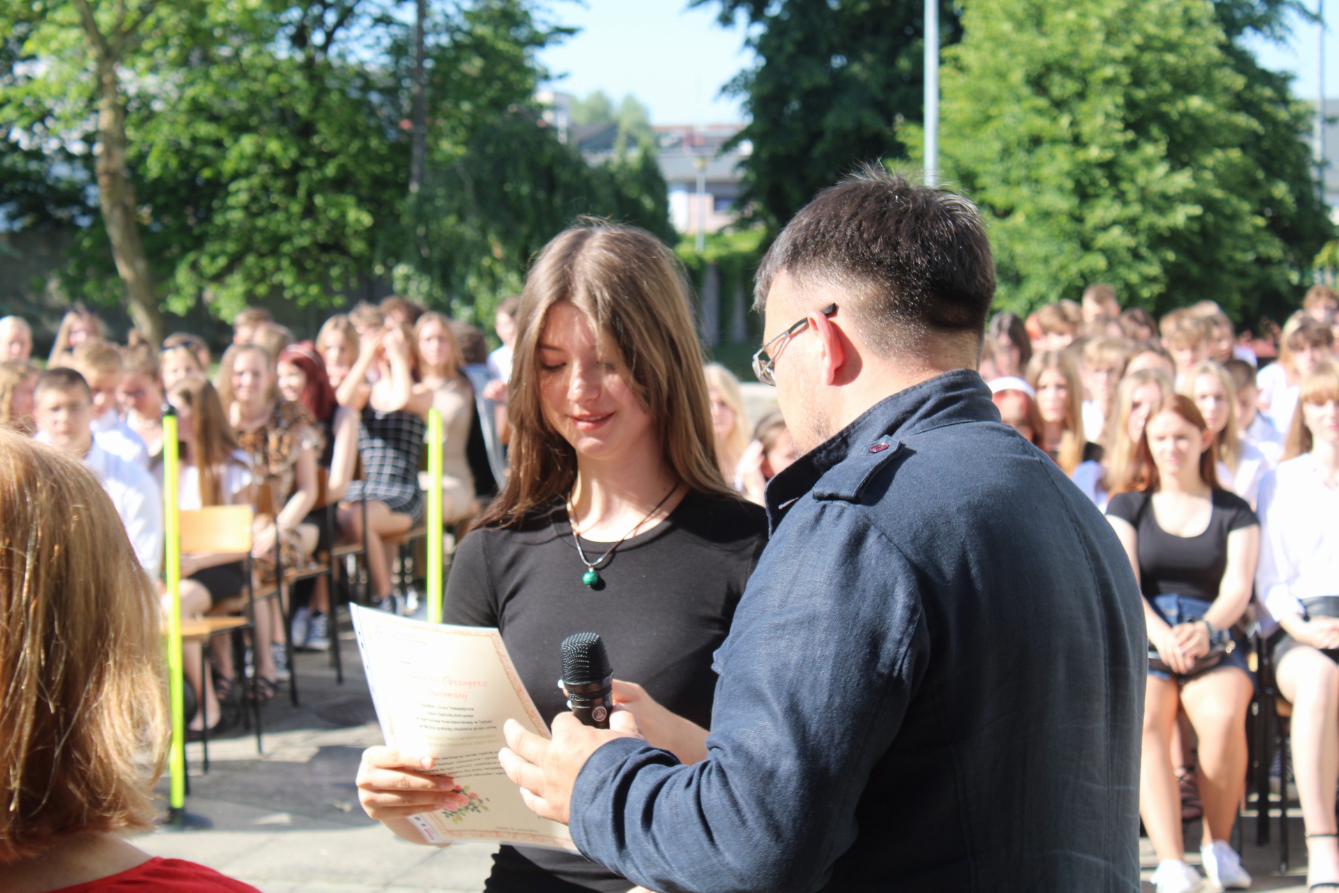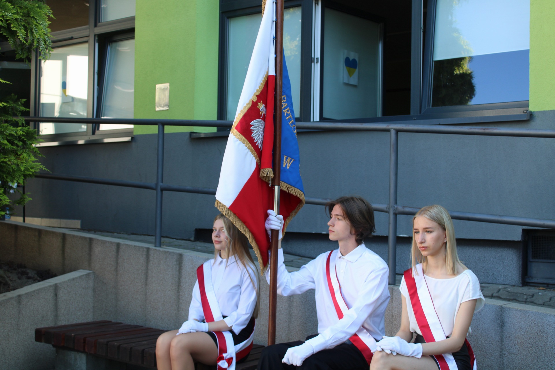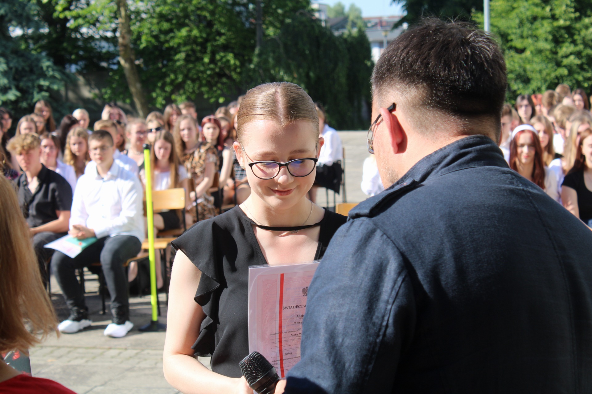 Prowadzący złożyli całej społeczności życzenia wspaniałych, zdrowych i bezpiecznych wakacji. Wspólnie zaśpiewaliśmy hymn szkoły, wyprowadzono sztandar i rozeszliśmy się do swoich klas.