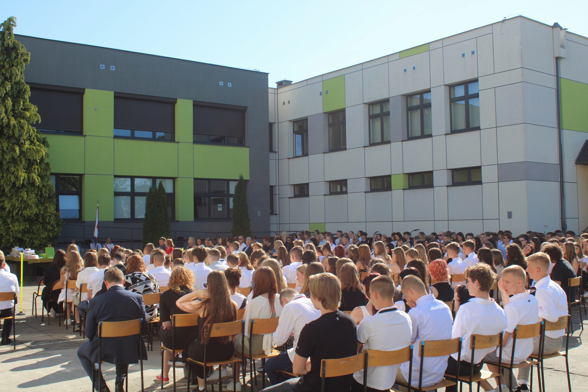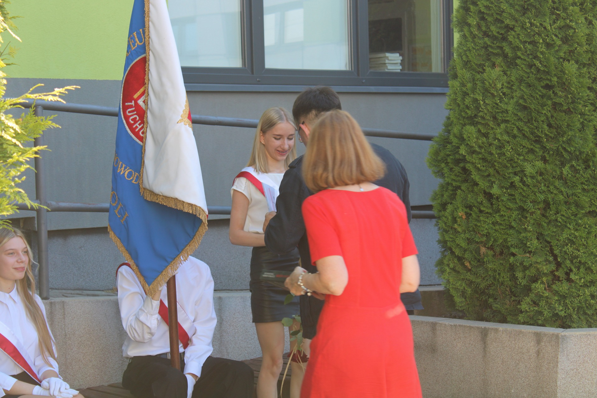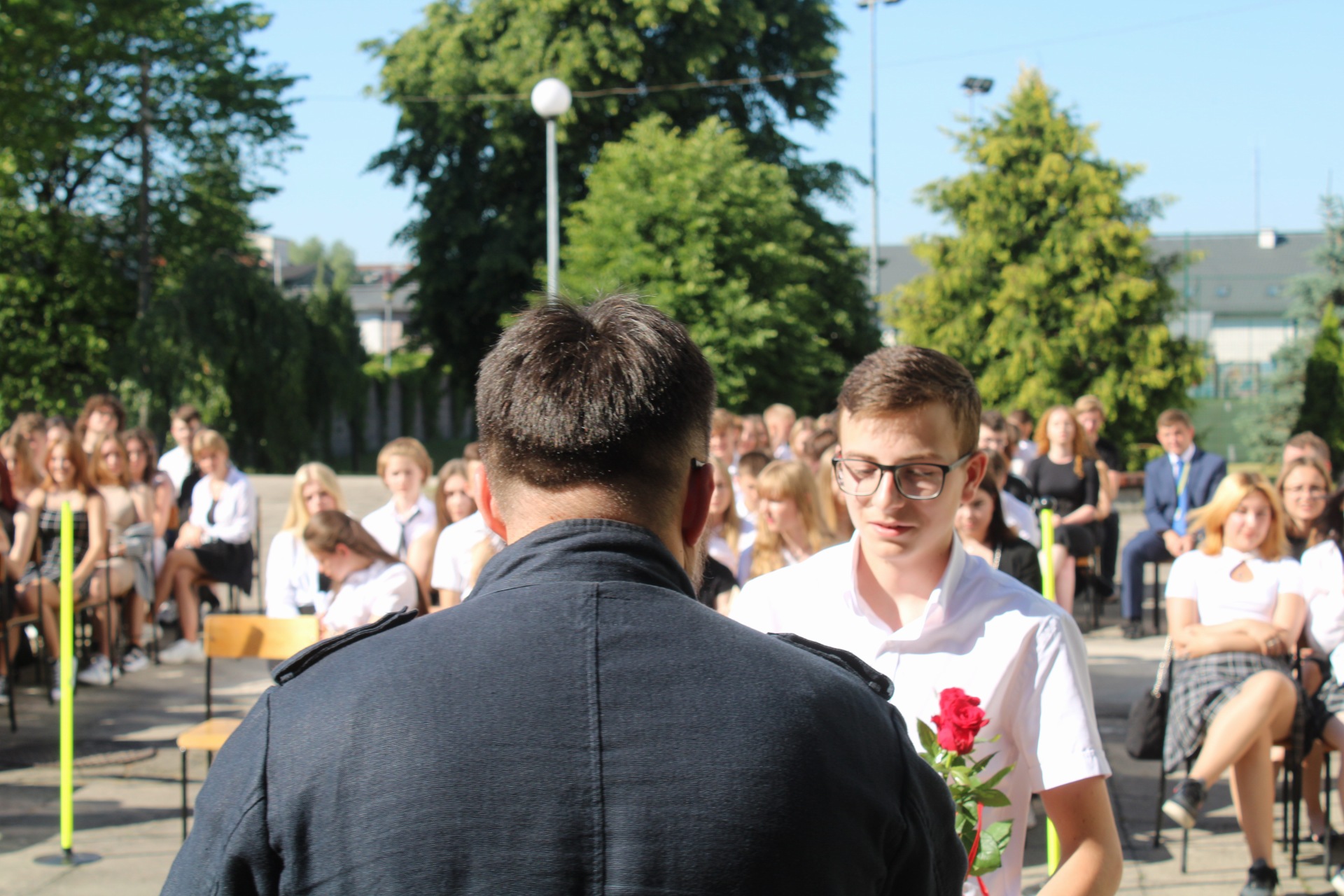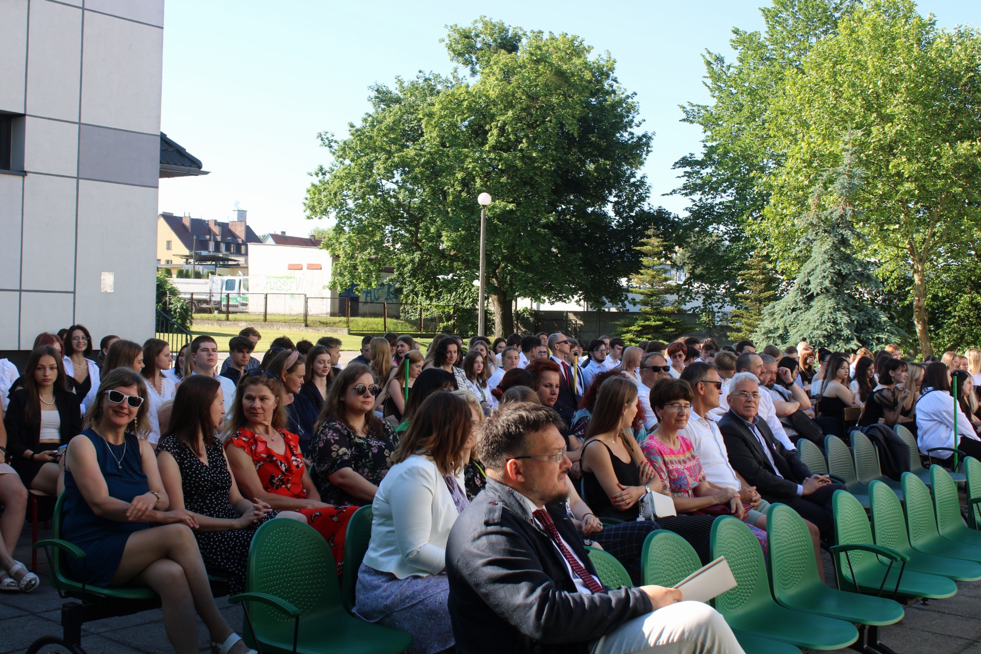 Prowadzący złożyli całej społeczności życzenia wspaniałych, zdrowych i bezpiecznych wakacji. Wspólnie zaśpiewaliśmy hymn szkoły, wyprowadzono sztandar i rozeszliśmy się do swoich klas.