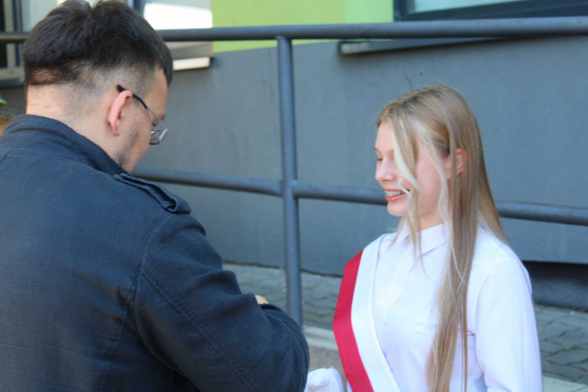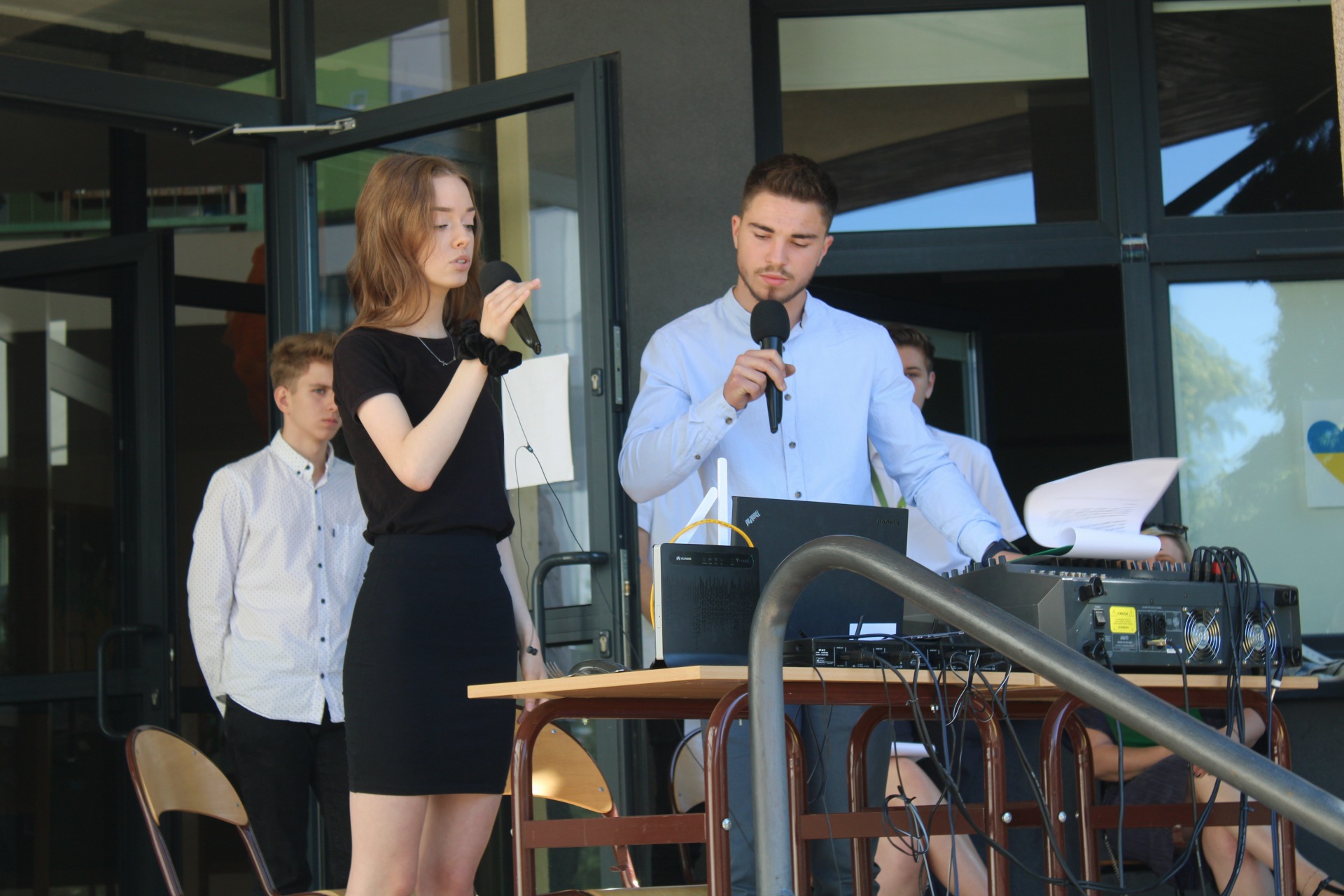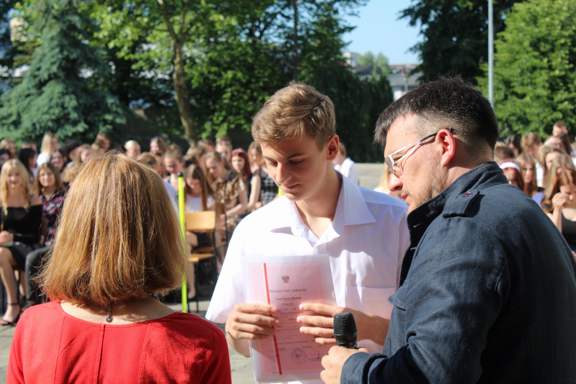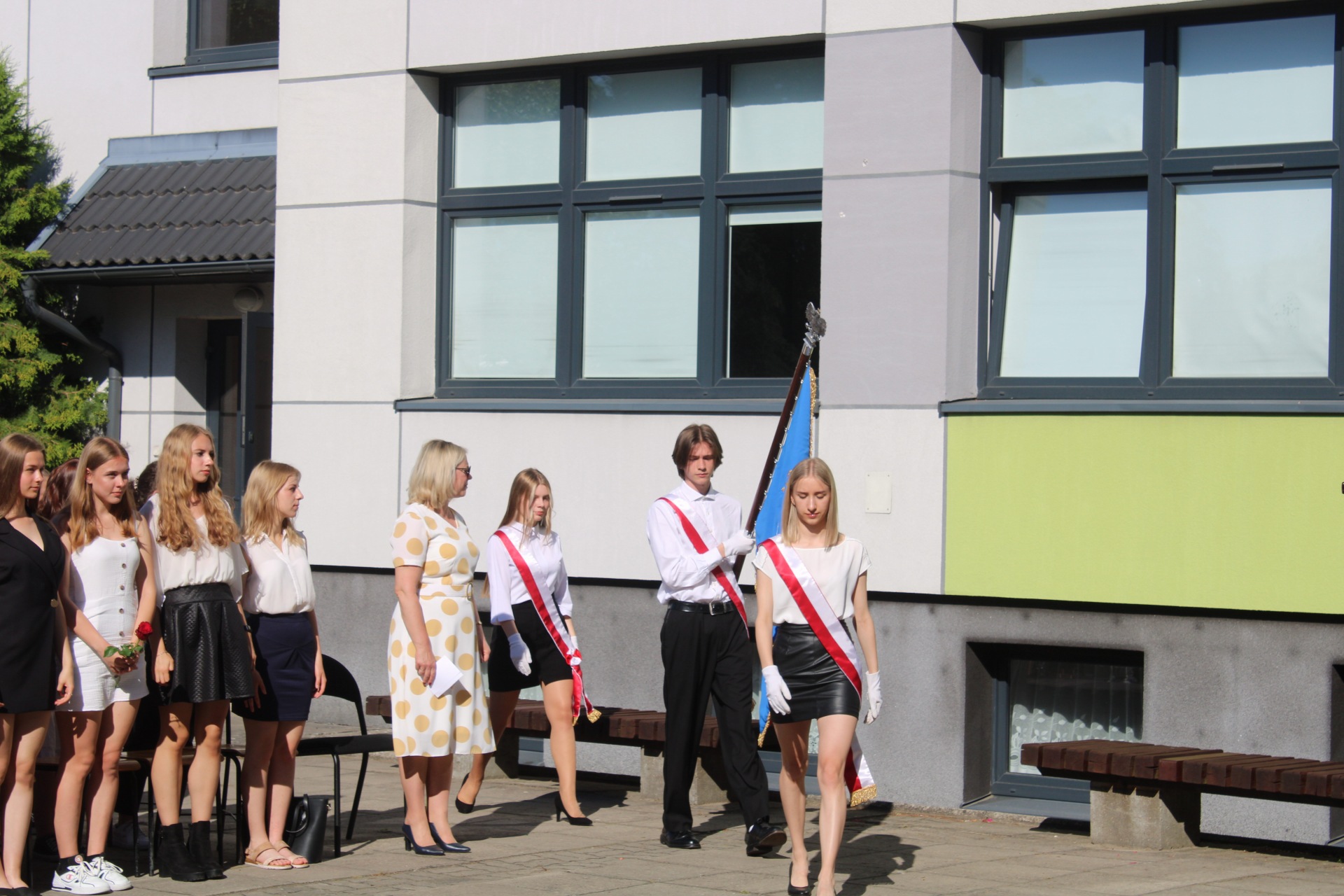 Prowadzący złożyli całej społeczności życzenia wspaniałych, zdrowych i bezpiecznych wakacji. Wspólnie zaśpiewaliśmy hymn szkoły, wyprowadzono sztandar i rozeszliśmy się do swoich klas.