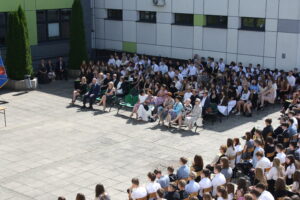 Prowadzący złożyli całej społeczności życzenia wspaniałych, zdrowych i bezpiecznych wakacji. Wspólnie zaśpiewaliśmy hymn szkoły, wyprowadzono sztandar i rozeszliśmy się do swoich klas.