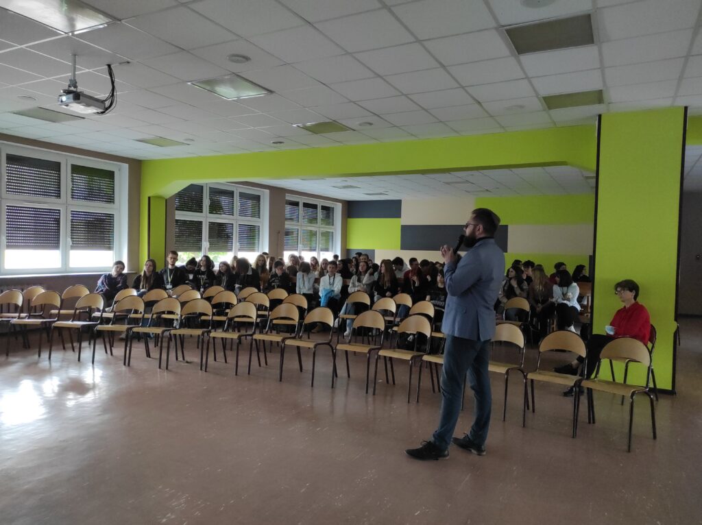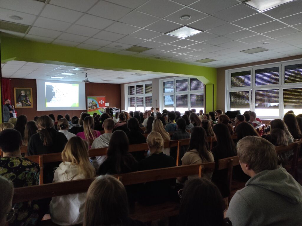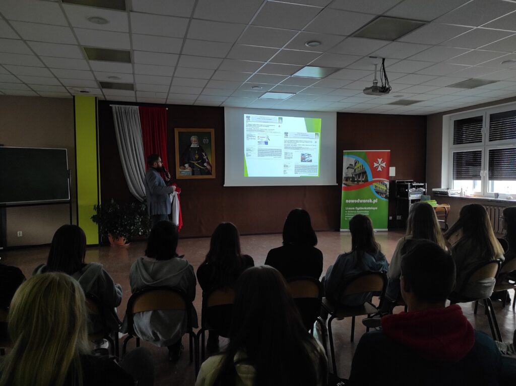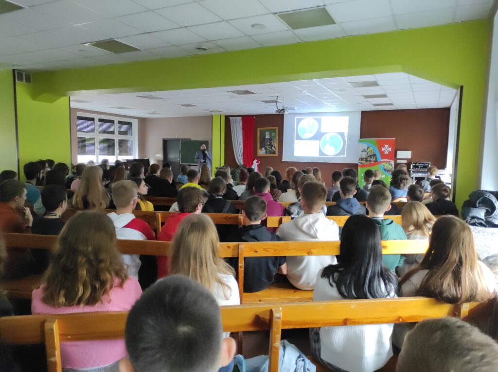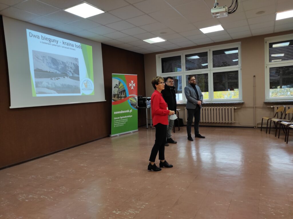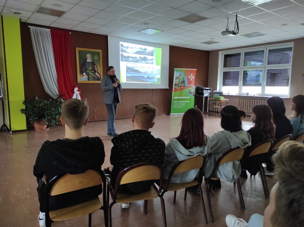 22 października w Nowodworku gościliśmy pracownika Instytutu Geografii Uniwersytetu Kazimierza Wielkiego w Bydgoszczy – Pana Sebastiana Czapiewskiego, który wygłosił prelekcję na temat zmian klimatu i badań polarnych. Uczniowie dowiedzieli się wielu rzeczy na temat pracy polarnika. Pan Czapiewski w interesujący sposób opisał swoje doświadczenia, które zdobył podczas pracy na Polskiej Stacji Antarktycznej im. Henryka Arctowskiego oraz na Polskiej Stacji Badawczej Horsund. Wykład, wzbogacony o pełną prywatnych zdjęć prezentację, dotyczył również warunków życia, pracy naukowca oraz fauny i flory Arktyki i Antarktyki. Najwięcej emocji wzbudziły ciekawostki dotyczące podróży oraz trudów życia na niebezpiecznym terenie z dala od cywilizacji.